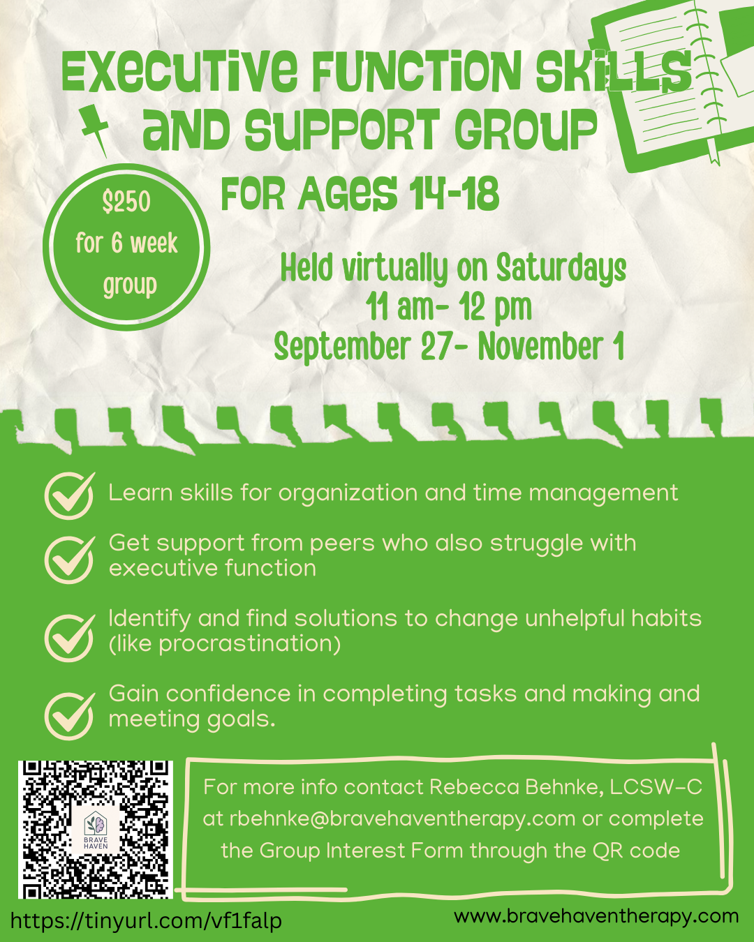 This group would be an excellent resource for teens with a diagnosis of ADHD, Anxiety, or Autism Spectrum Disorder who could use additional support with developing skills for executive function.